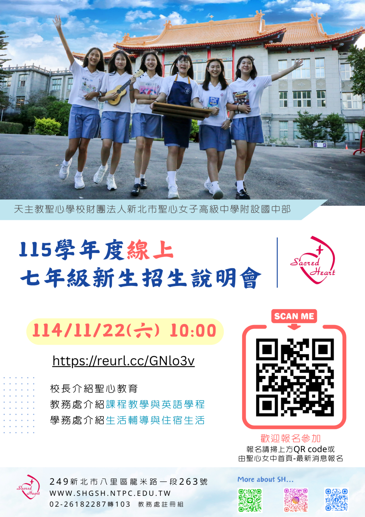 轉知天主教聖心學校財團法人新北市聖心女子高級中學辦理115學年度七年級新生線上招生說明會,歡迎六年級女學生及家長踴躍報名,詳如附件。