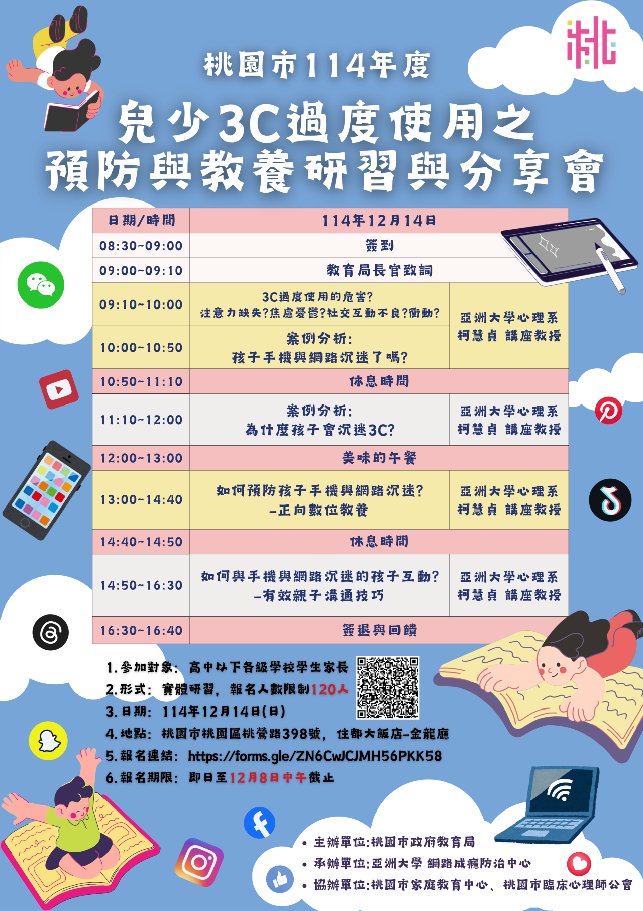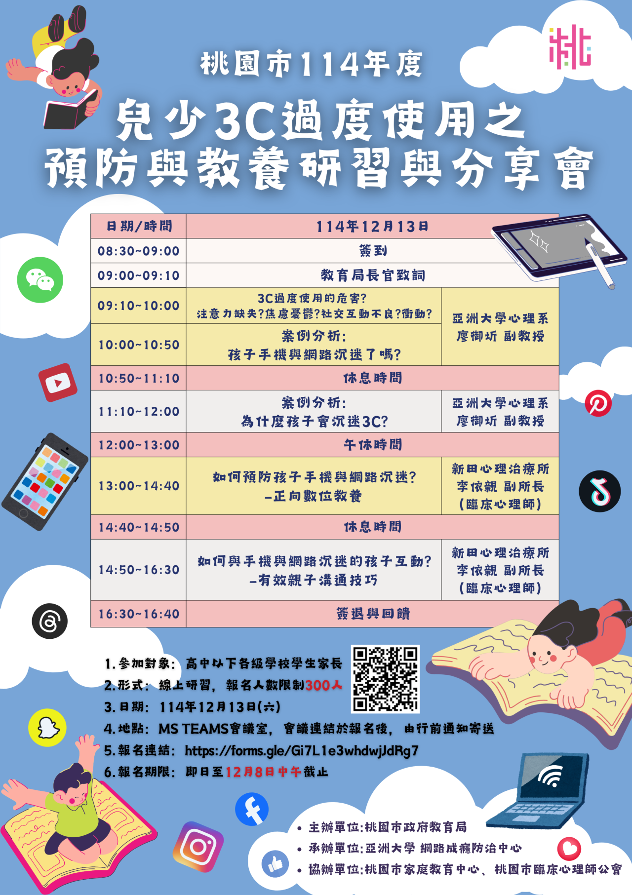 | 倘有相關問題,請洽亞洲大學網路成癮防治中心高小姐,聯絡電話:(04)23323456分機3606。 |