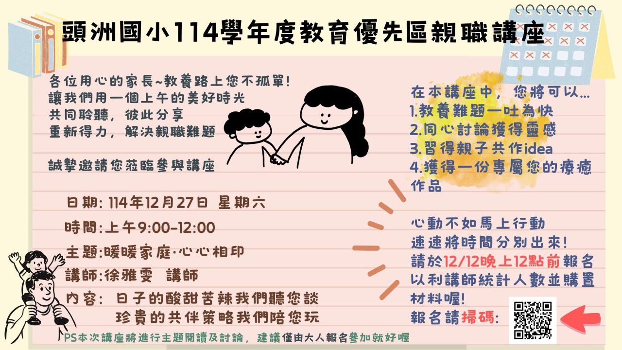 轉知頭洲國小辦理114學年度教育優先區親職教育講座「暖暖家庭‧心心相印」一案,歡迎教職員、家長踴躍參加。